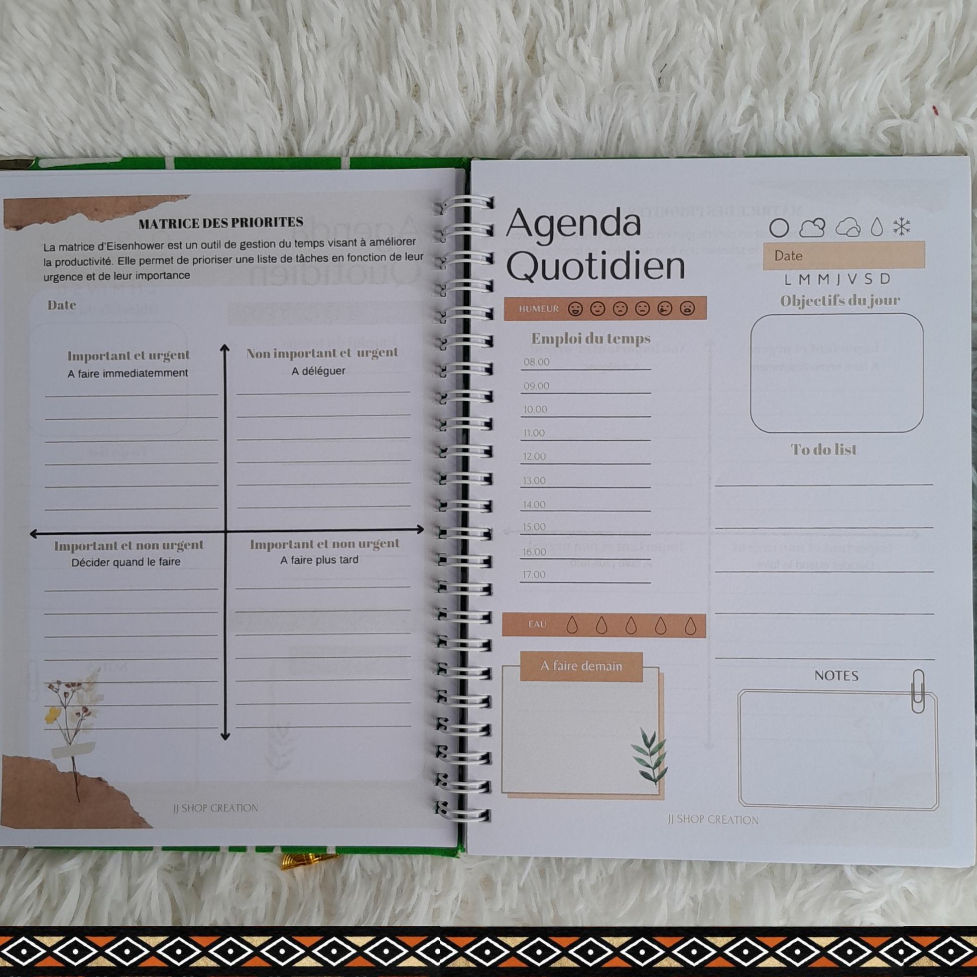 Marre de courir après le temps ? Cet agenda a été conçu pour vous aider à reprendre le contrôle de vos journées et avancer avec clarté. Un véritable allié au quotidien pour structurer vos idées, suivre vos priorités et progresser en toute sérénité.
