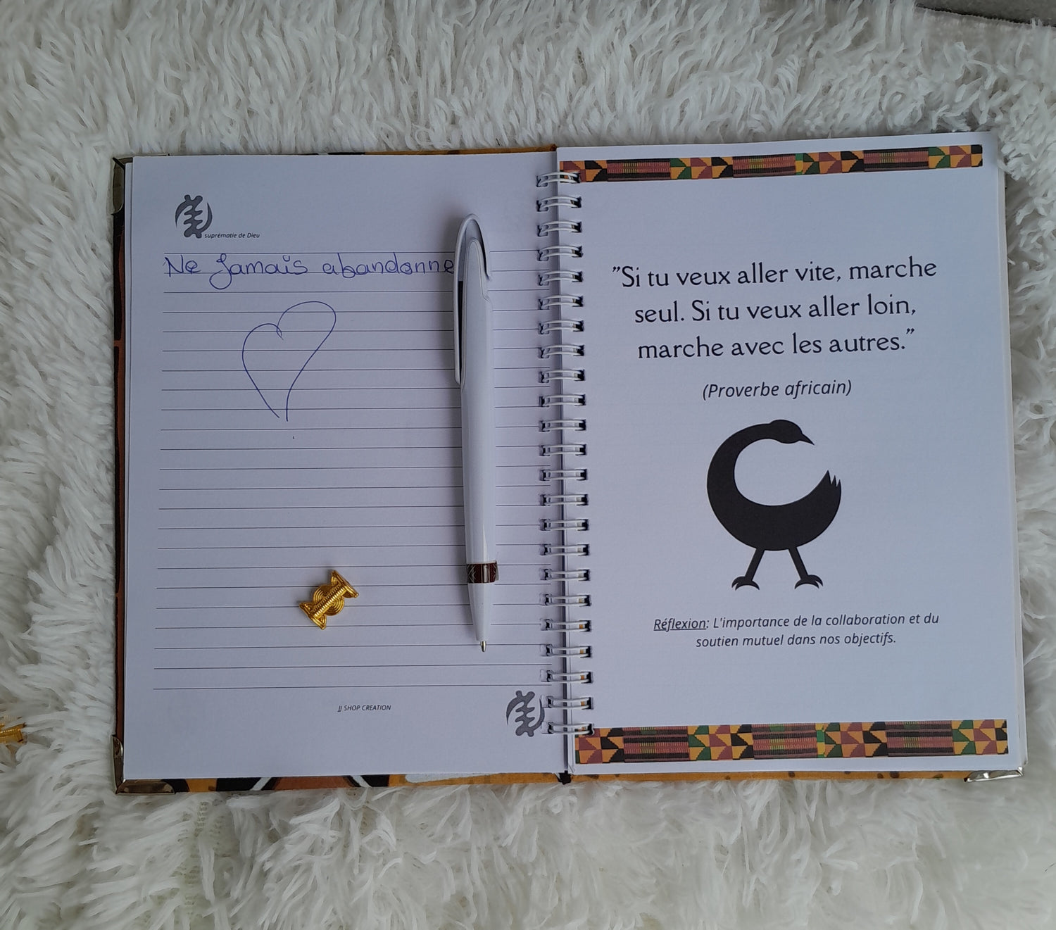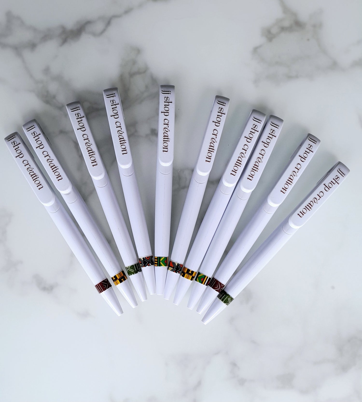 À glisser dans un carnet, une trousse ou à poser sur le bureau : ce stylo attire toujours les regards. Et avec son motif en pagne, il raconte une histoire à chaque trait.